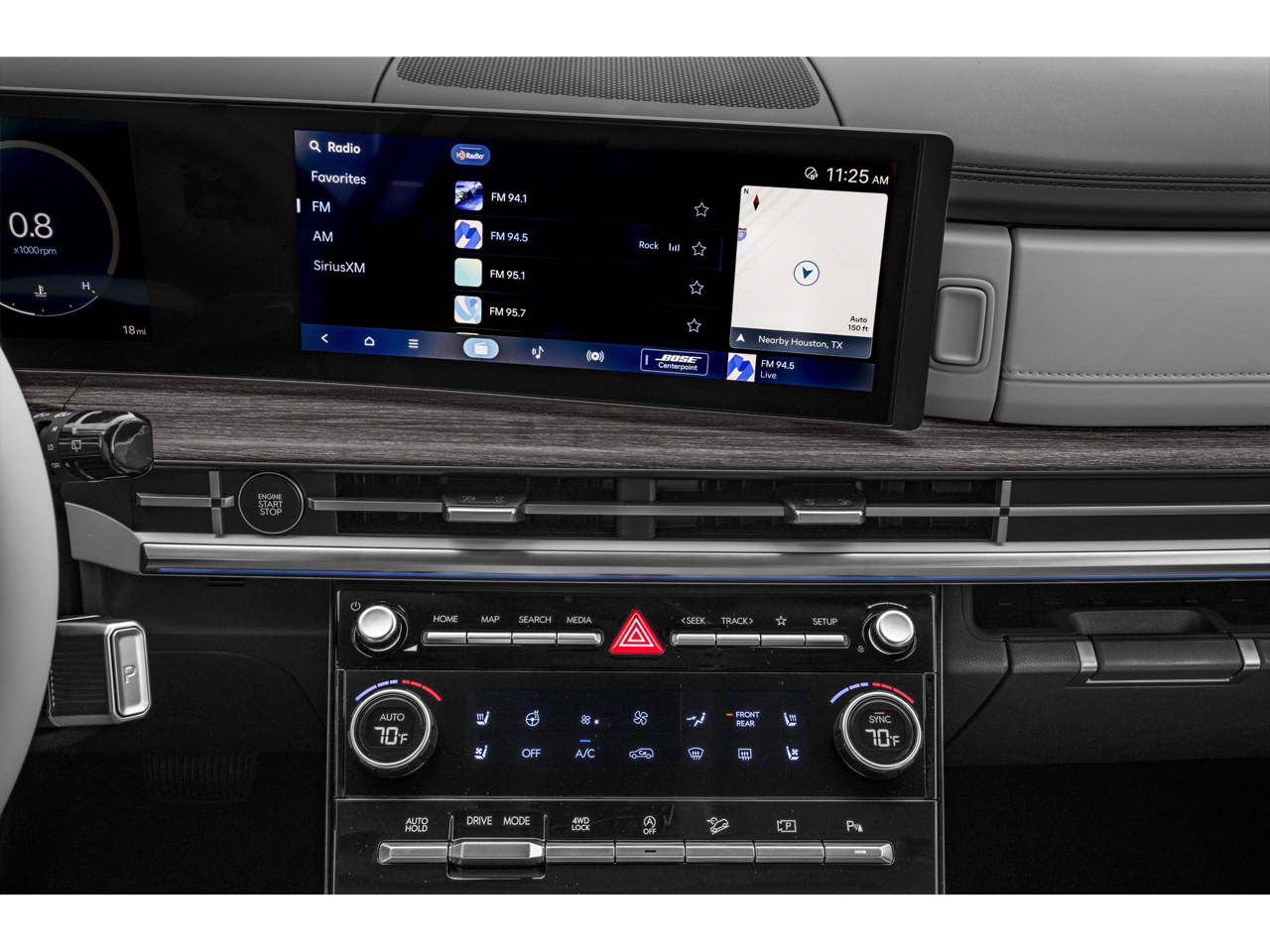 - Radio: AM/FM/HD Bose Premium Audio System -inc: 12 speakers including subwoofer, external amplifier, 12.3" wide touchscreen, Apple CarPlay and Android Auto, Bluetooth hands-free w/wireless audio streaming, dynamic voice recognition, USB connectivity, SiriusXM, Blue Link connected car system, navigation system including traffic flow w/incident data via HD Radio (HERE) and rear seat quiet mode